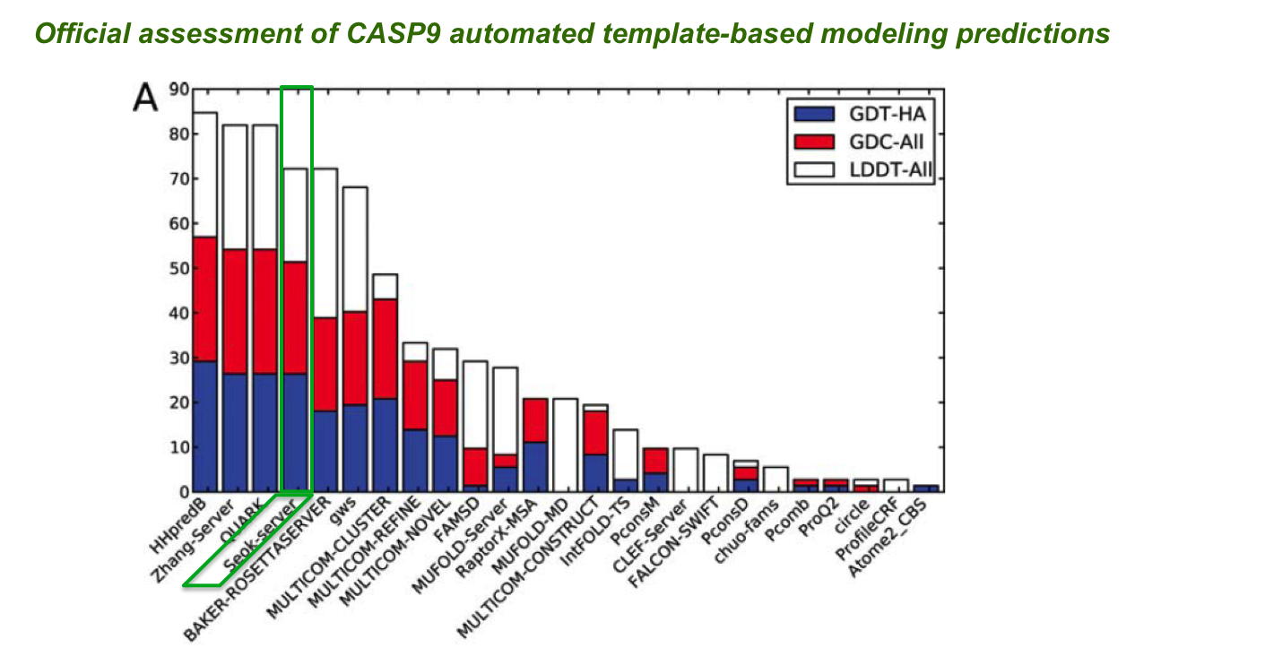 The CASP (Critical Assessment of the techniques for protein Structure Prediction) experiment is a community-wide protein structure prediction competition in which more than 100 groups from various countries test their prediction methods. In our first participation in CASP (CASP9, 2010), our automated prediction server “Seok-server” (based on the “GalaxyTBM” method2) was evaluated to be “among the top six servers” in the template-based modeling (TBM) category (the largest and the most important category in CASP) according to the official assessment by the CASP organizers.