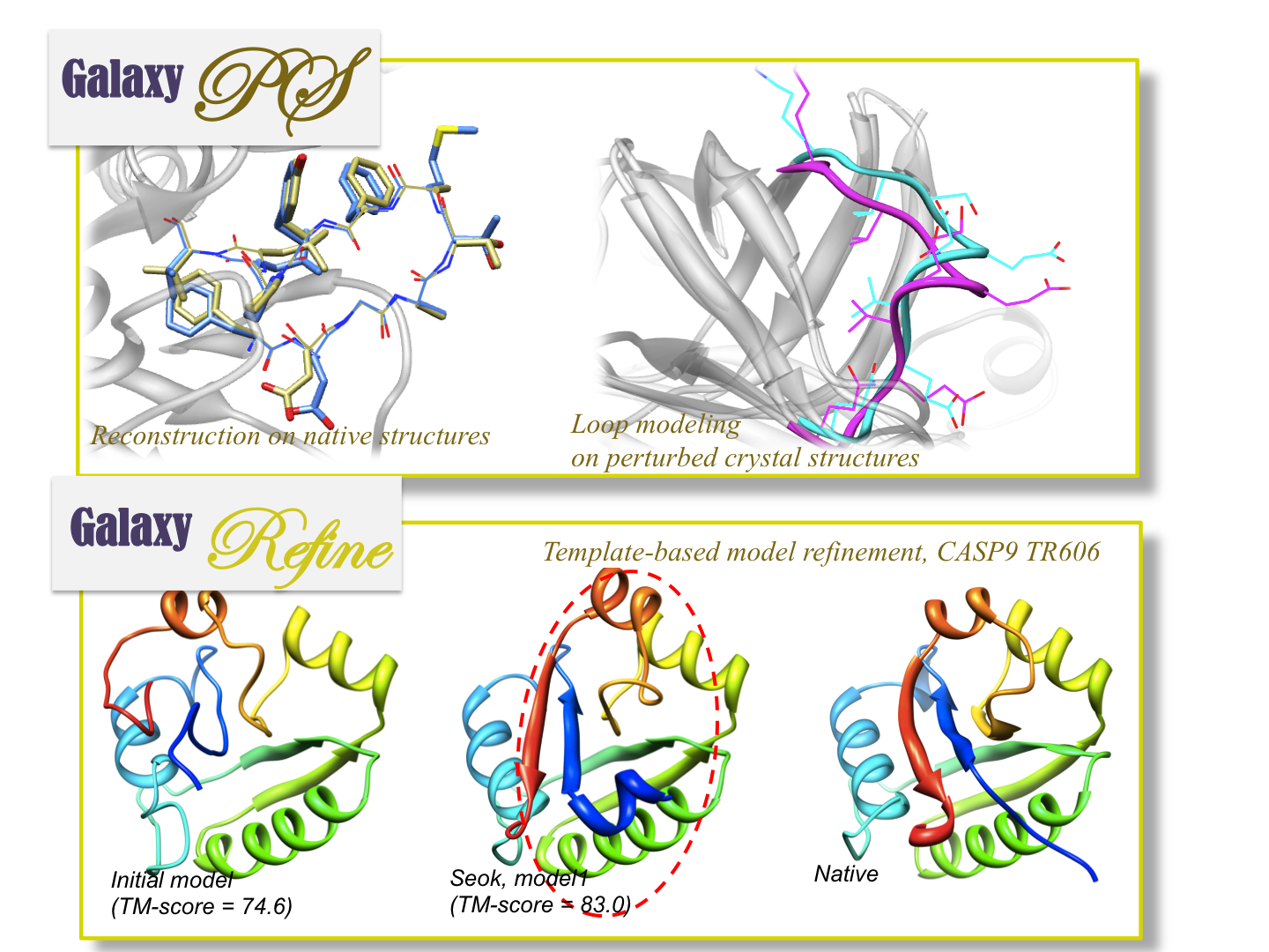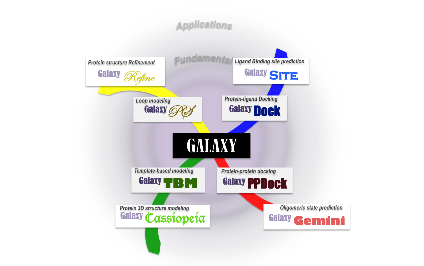The philosophy underlying the GALAXY development is to provide more “practically useful” information to experimentalists, such as more “reliable” model structures, by fusion of available tools and knowledge in diverse disciplines such as chemistry, physics, computer science, or bioinformatics. GALAXY currently utilizes various scoring functions (e.g. molecular mechanics, implicit solvation models, statistical scores) and sampling techniques (e.g. molecular dynamics, genetic algorithm, Monte Carlo simulation, conformational space annealing) to achieve the best performance in each modeling task.