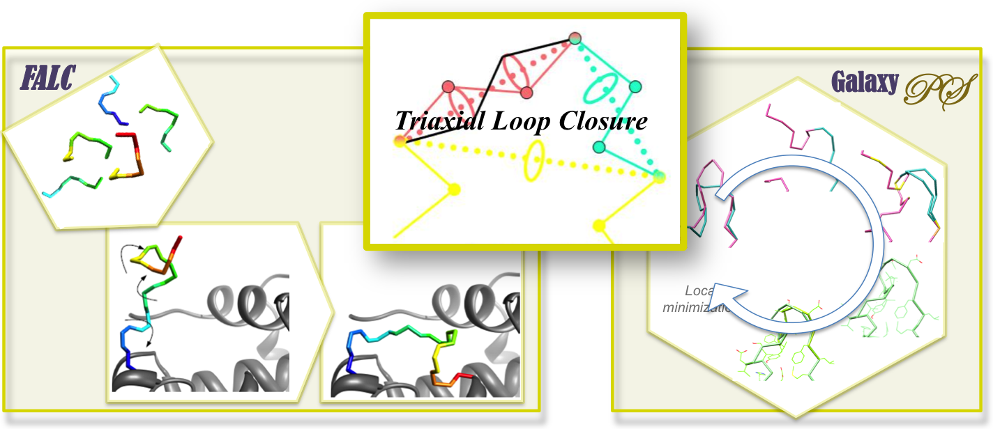Protein loop modeling is one of the areas of our specialty. Loop modeling is applicable to the studies related to protein flexibility. All our loop modeling methods have grounds on the loop closure algorithm called “triaxial loop closure”34. For example, an ensemble of loop conformations can be generated by “FALC”56 that combines the loop closure and the local structure sampling technique of fragment assembly (web service available at FALC web server). In the more advanced loop modeling method “GalaxyPS”789 (web service available at GalaxyWeb, loop closure is used as an elementary move set during global energy optimization.